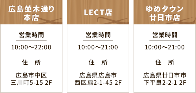 広島市中区・西区、廿日市市に店舗があり、通いやすさも魅力です。