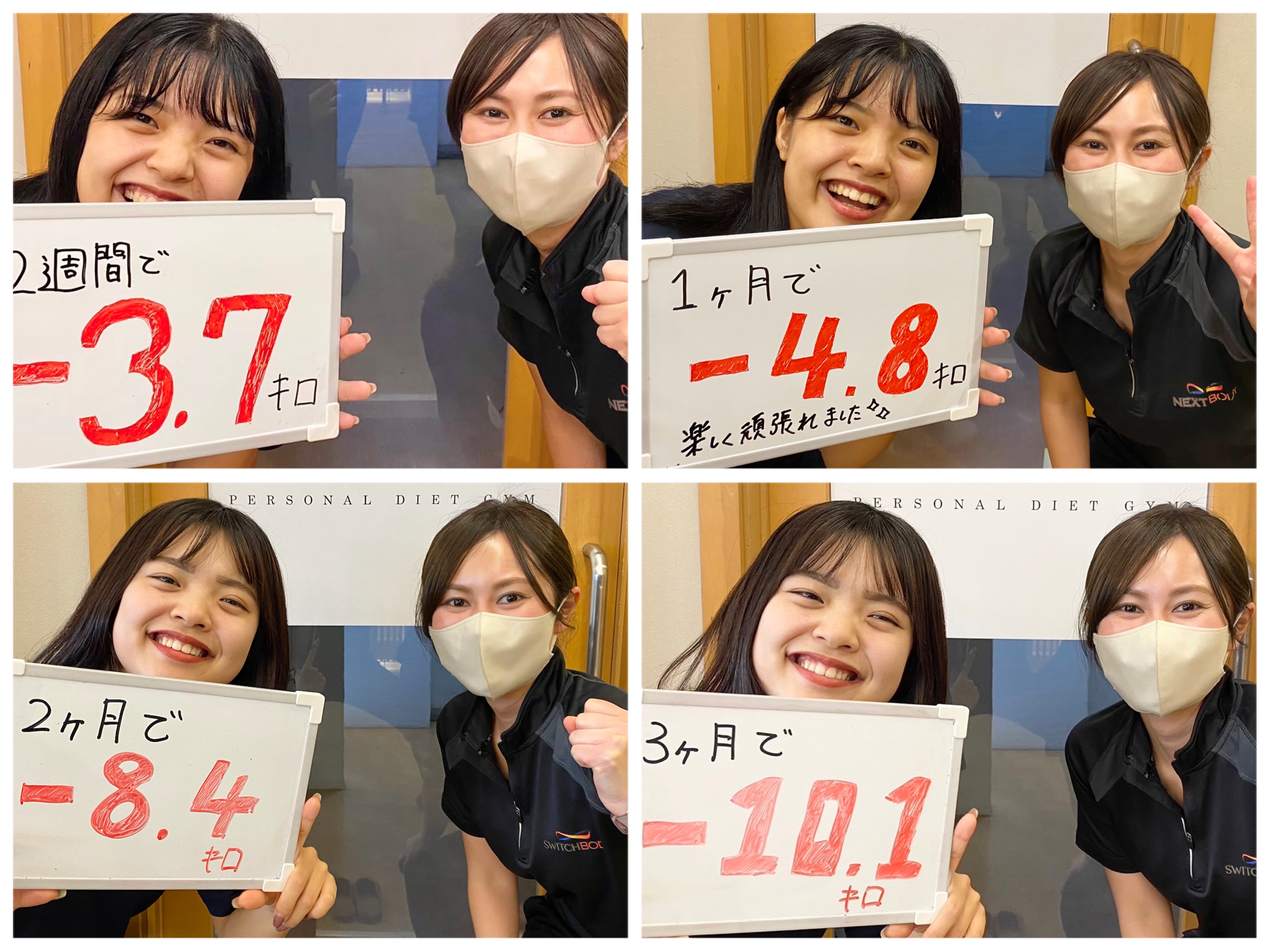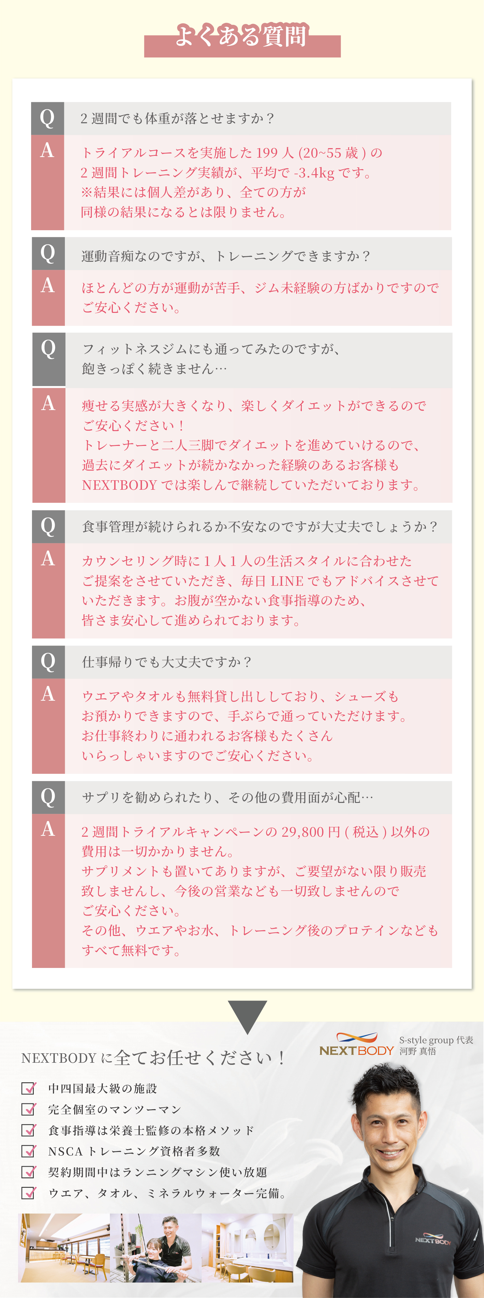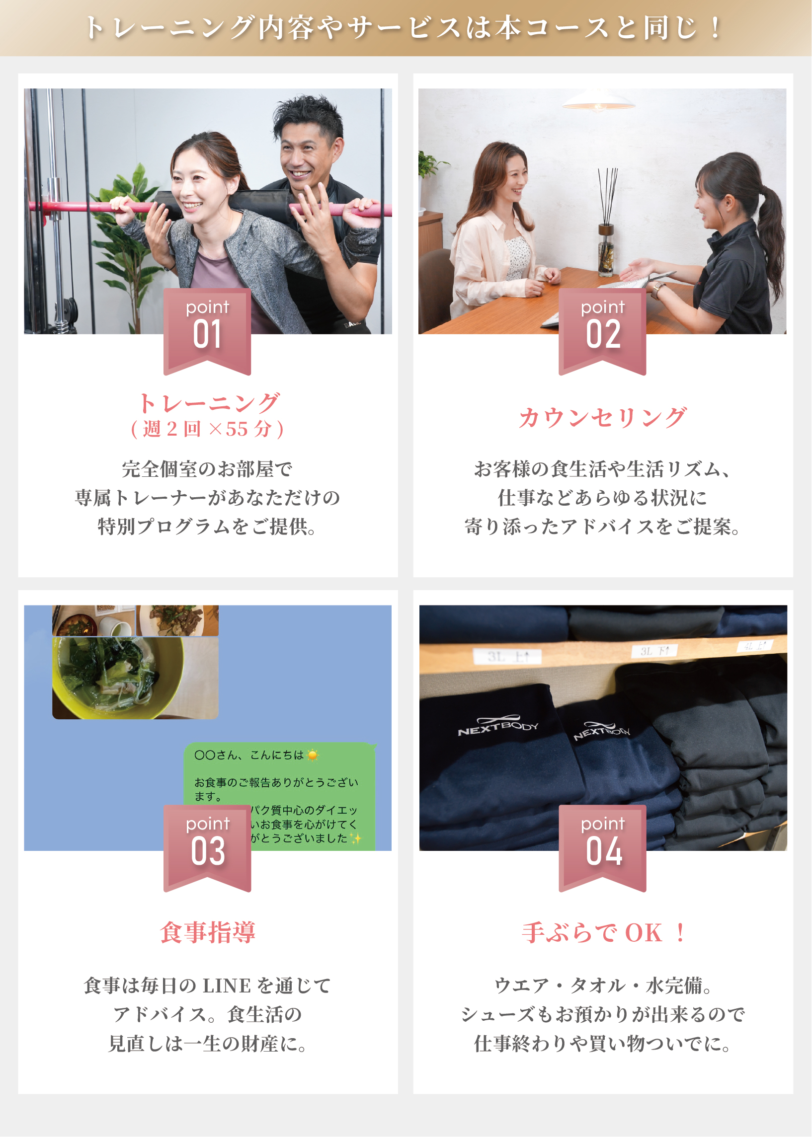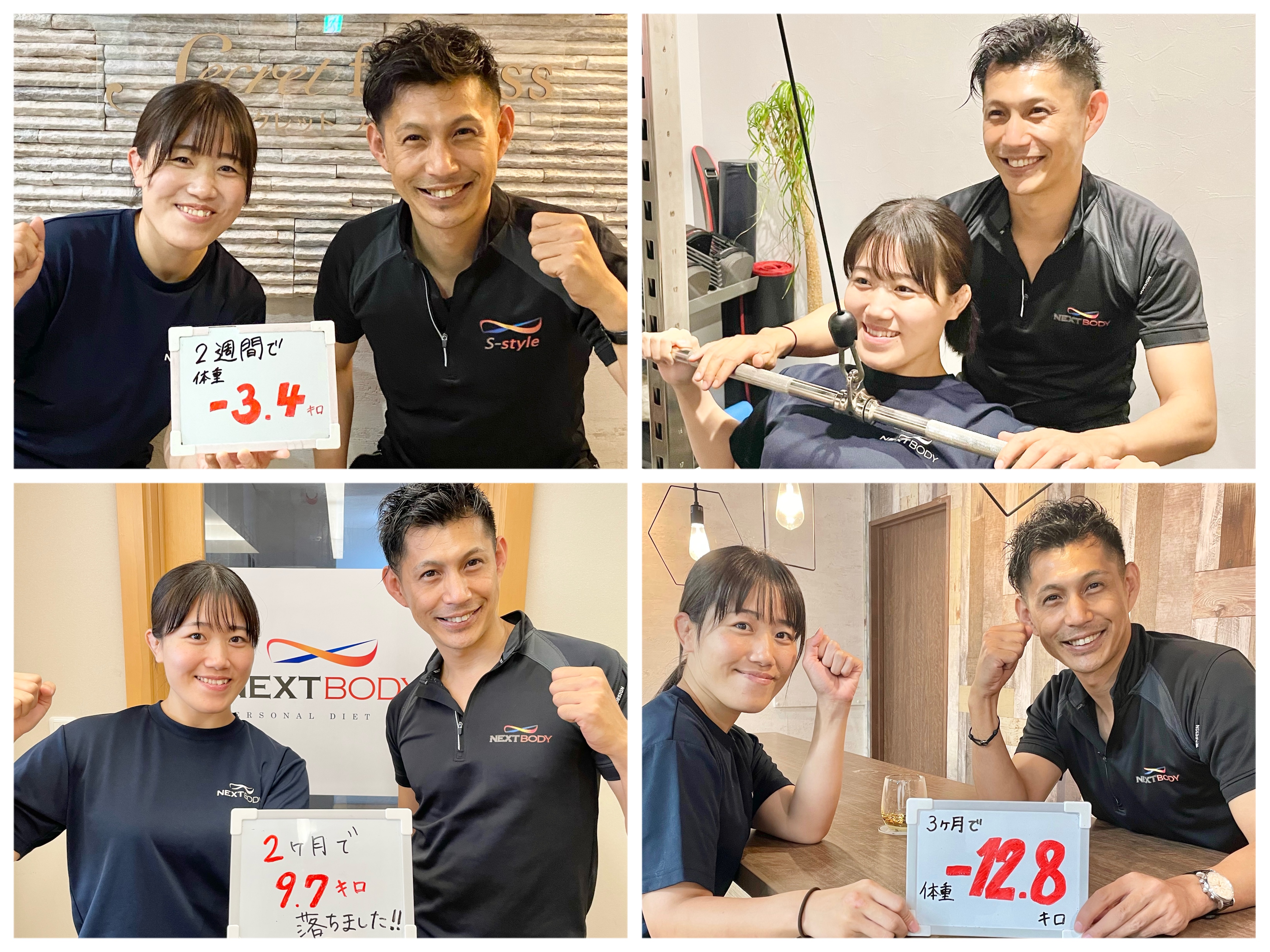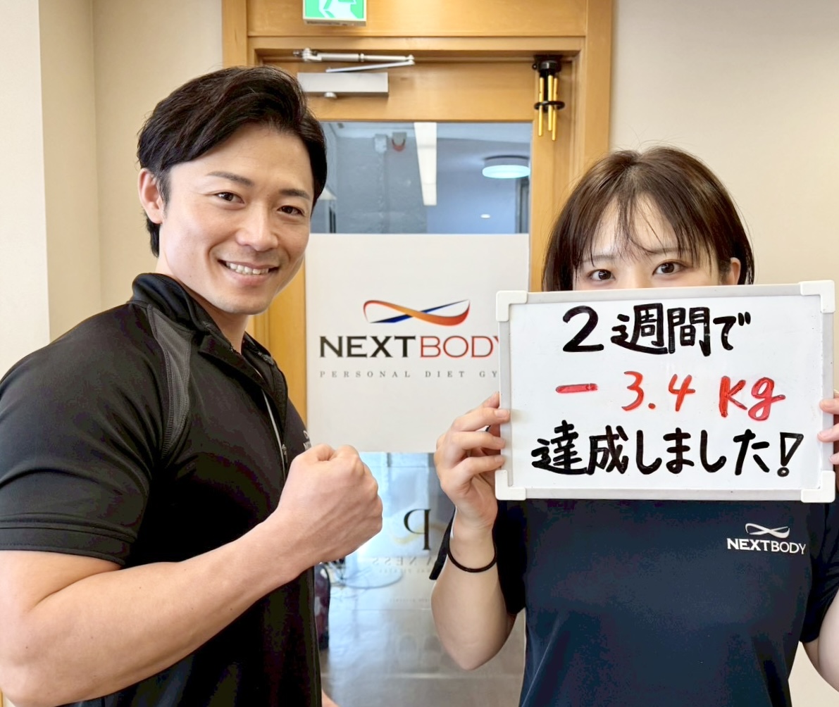 パーソナルトレーナーがご指導させていただくことで飽きっぽい方や トレーニングがはじめての方でも楽しいトレーニングができます。 ダイエットの食事もその方の生活背景合わせて 的確なお食事アドバイスでサポートさせていただきます。 お金もトライアルで29,800円(税込)以外のお代金はいただきませんのでご安心下さい。 ※トライアルコースを2週間実施したN=199人(20歳~55歳)を対象に、2週間の結果を処理した結果。期間は2022年6月~2023年5月の1年間の結果。※日本ビジネスリサーチ調べ 【体験談:S様(20代女性)】2週間で「-3.4kg」!憧れの洋服を着るために 知人がNEXTBODYに通ってダイエットに成功したのを聞いて私も入会しました。今までダイエットの失敗続きだった私が本当に2週間で変われるのかと最初は半信半疑でしたが、2週間で気づけば-3.4kgと短期でのダイエットに成功しました。 トレーナーさんからの毎日の食事LINEでの励ましや、毎回トレーニングに行く度に私の毎日の取り組みの過程を褒めてくださり、それがモチベーションになって本当に楽しく体重を落とすことができました。 【体験談:O様(30代女性)】 忙しくて外食が多かった私 非常に外食が多い生活を送っていましたがチャレンジした結果、2週間で− 3.4キロ達成しました。 太田トレーナーが自分がネックだった外食に対して「たくさんの同じような悩みを持った方がいらっしゃるので、たくさんの成功事例がありますのでたくさん提案できますよ」という言葉にやる気が出ました。 本気でいつも接してくださるので、太田さんの為にもやせたいと言う気持ちに途中からなっていたのがモチベーションにもなっていました笑。いつも気持ちを高めてく本当にありがとうございました! 【体験談:S様(20代女性)】 2週間で-3.7キロ!下橋さんからの手紙が嬉しかった 短期間で痩せた知り合いがネクストボディに通っているのを知り、結婚式が決まり痩せなくてはと思い2週間トライアルを受けて− 3.7キロ達成しました。その後続けて最終的には10キロほど体重が落ちました。 最終日に下橋さんから手紙をもらったことも非常に嬉しかったです。手紙も頑張ったことに対しての感謝の気持ちが書いてあり、体重が落ちたことも本当に嬉しかったのですが、心から下橋さんがトレーナーでよかったです! 【体験談:O様(20代女性)】 いつも食事メールで褒めてくれる山﨑トレーナー 2週間で− 3.5キロを達成しました。本当に楽しくダイエットに取り組めたのは、山崎さんが毎日食事メールでちょっとした工夫などを褒めてくれたからです。 とにかくトレーニング中も楽しく褒めながらやってくれ気持ちをどんどん上げてくれるので、トレーニングなどはあっという間に時間が経ちますし、昔から運動が苦手ですが、気持ちをのせてくれて、私の運動力に合わせてくれたので、運動が初めて楽しく感じました。 最終的には3ヶ月で、− 10.7キロ達成!ほんとに感謝です。 【体験談:Y様(30代女性)】 2週間で4.5キロも体重が落ちました! 2週間トライアルで4.5キロ達成することができました。いつも本当に河野トレーナーが前向きな言葉をかけてくれて、楽しくできてあっという間の2週間でした。 過去にリバウンドをしたことがありますと、カウンセリングの時にお話ししたのですが「2週間の間で体調落としながら、今後もご自身でダイエットを無理なく続けれるようにご指導させていただきますね」とジムに通うその後のことも考えてお言葉いただけたので、とても嬉しかったのが記憶に残っています。 いつも自己肯定感を上げてくれて頑張ったことをいつも褒めてくれるので、食事メールもすごく楽しかったです。