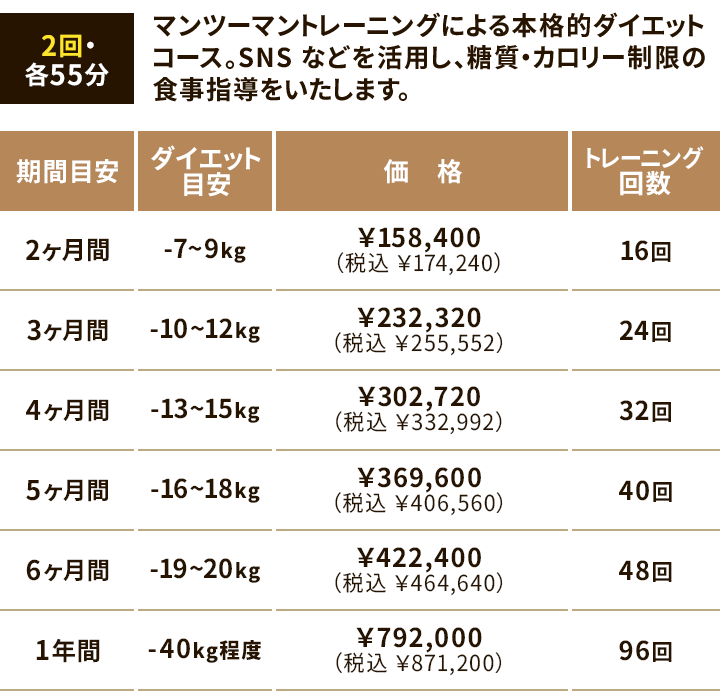 一番人気のコースで、本格的なダイエットコースを体験できます。SNSなどを活用し、食事指導・カロリー制限の食事指導をいたします。